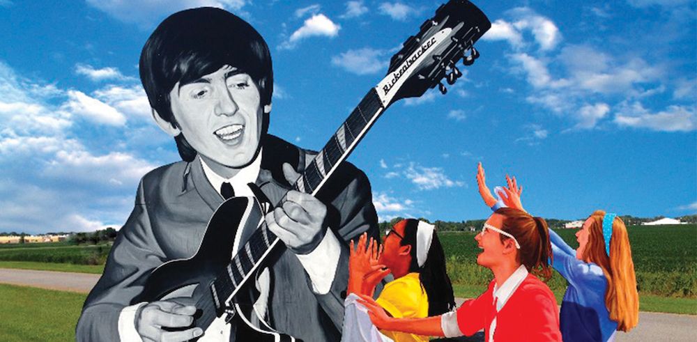 I had a work event in southwest Illinois last month and on the drive in we encountered a bizarre and beautifully painted standalone mural of my personal favorite Beatle George Harrison, complete with ecstatic fans. This monument appears out of nowhere along Highway 57, with no real explanation or purpose: just a bright, photorealistic 3D mural popping up from seemingly endless fields of soy and corn.