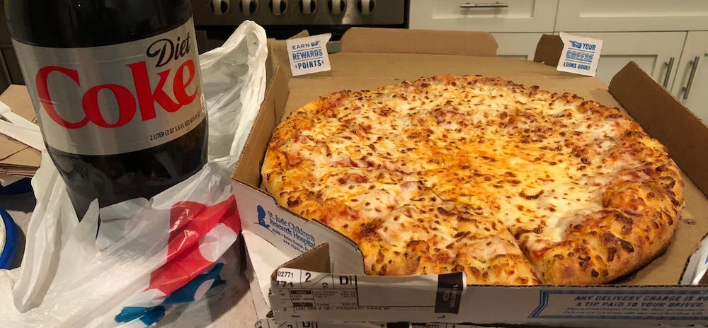 It's a tired "obesity crisis" trope to mock someone for eating pizza while drinking a diet soda, but guess what: IT'S REALLY GOOD. I rarely drink soda at all anymore, but there's something about regular-degular, aspartame-riddled Diet Coke that goes so well with a cheesy slice or a fast-casual taco trio or a juicy cheeseburger. All of these foods are considered "junk" by most of society, and they also happen to pair really well with a tall, cold beer – and yet we don't explicitly mock people for drink beer with these foods.