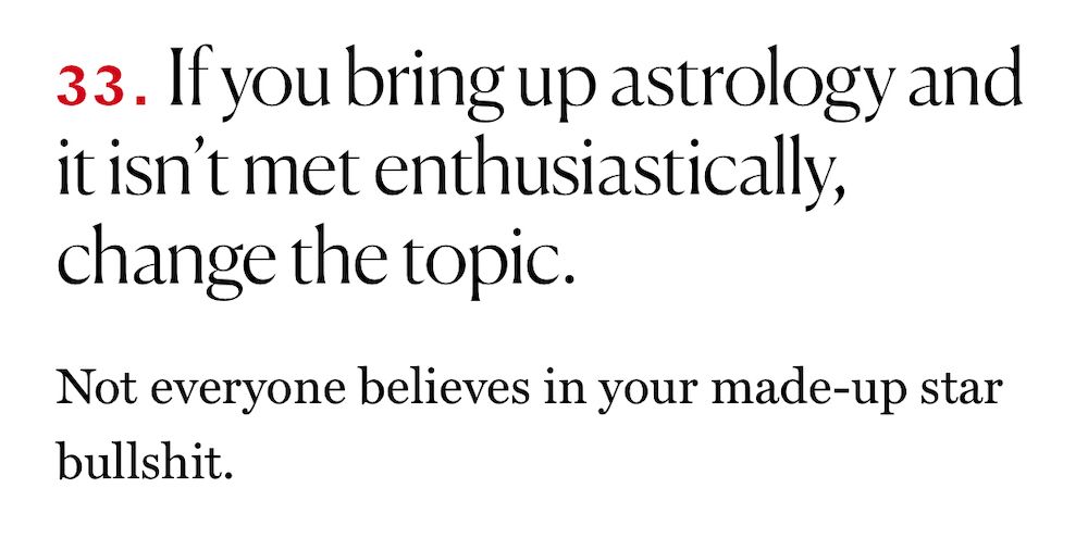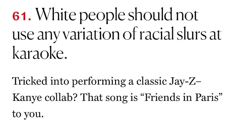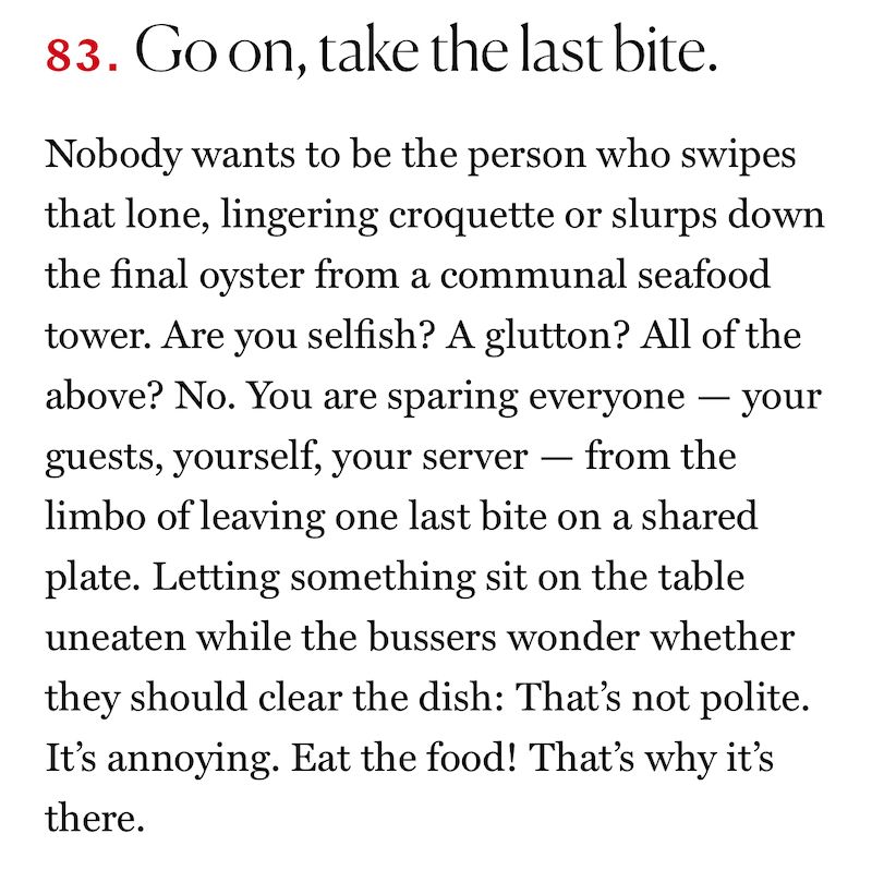 Last week, the Extremely Online/Still on Twitter For Some Reason world was all atitter about New York Magazine’s “New Rules” of etiquette, some of which were spot-on, some absolutely ghastly, and some a little too specific to just living in New York City. Here are a few of my faves from their list: