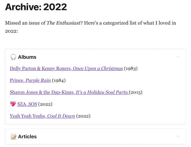 👉🏻 Hot DAMN, Subscribers, my best beloveds, have I got a treat for you! All subscribers can now access the 2022 Enthusiast Archive, a complete rundown of everything I loved and wrote about in 2022, sorted by category.